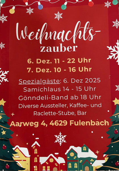 Gerne empfehlen wir den Weihnachtszauber am Aarweg in Fulenbach. Unter anderem mit Verkaufsstand von unserem Vereinsmitglied Sonja Loosli.
