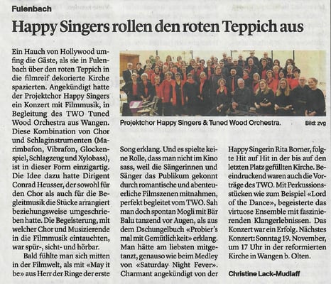 Die Happy Singers durften zusammen mit der Harmoniemusikgesellschaft Fulenbach vor vollbesetzten Rängen konzertieren. Wir hatten eine sehr angenehme Zusammenarbeit mit der HMG. Und über den grossen Publikumsaufmarsch haben wir uns sehr gefreut. Aus Sicht des Publikums wurde von Fritz Mosimann einen Bericht erstattet. Wir danken ihm herzlich dafür.