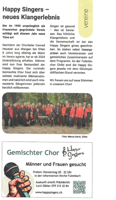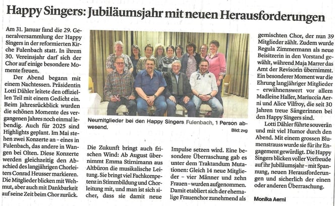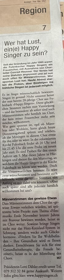 Die Happy Singers sind dankbar, die reformierte Kirche Fulenbach als ihr Probelokal nutzen zu dürfen und das seit gut 10 Jahren. Lesen Sie mehr darüber in angefügtem Artikel.