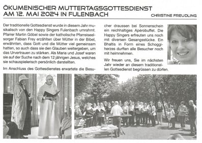 Am diesjährigen Muttertag umrahmten die Happy Singers den ökumenischen Gottesdienst in der reformierten Kirche Fulenbach mit Gesang. Das anschliessende Apéro fand draussen statt, ebenfalls gesanglich begleitet von den Happy Singers.