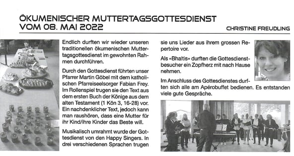 Im reformierten Kirchenblatt dem "Gemeindebrief" vom August 2019 konnte ein Rückblick zum Muttertags-Gottesdienst nachgelesen werden.